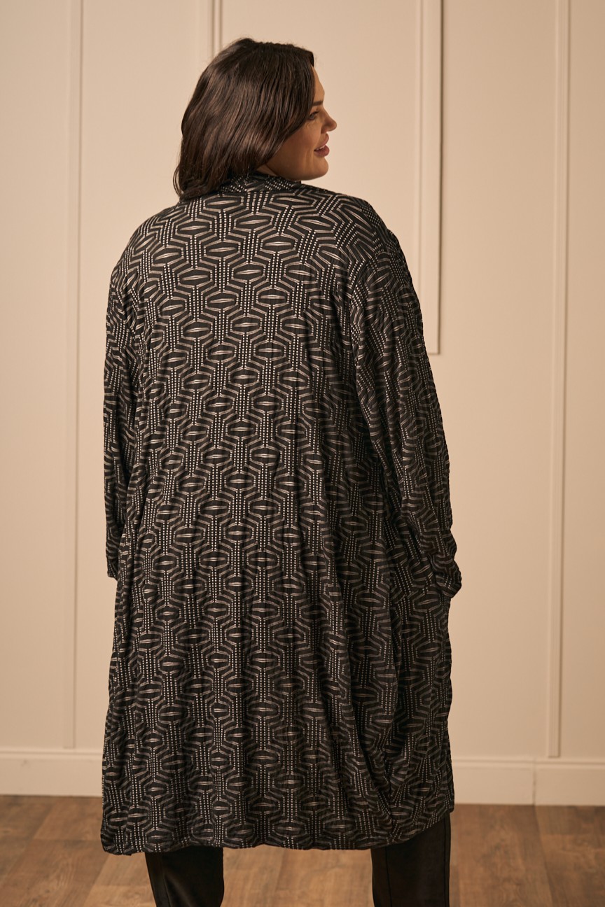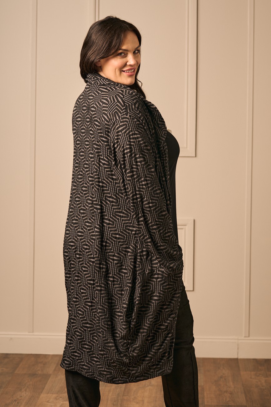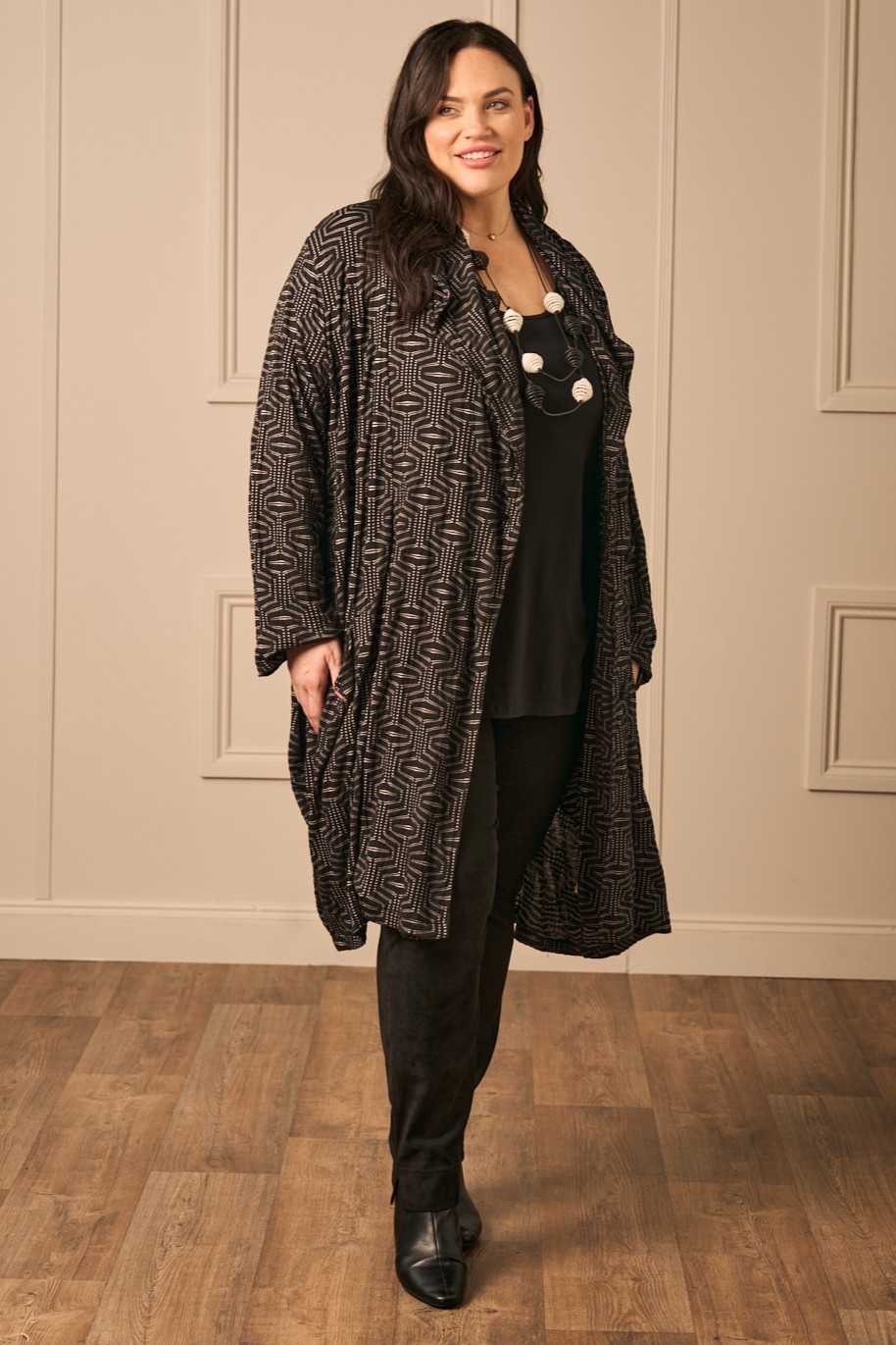 This one size AKH coat is absolutely fabulous with some wonderful styling that makes it hang beautifully when worn on its own or over the matching AKH Dress. The fabric is a textured jersey and very “springy”! The lapels are shaped like a shawl collar leading down to two large buttons fastening at the front. The coat front has very clever panels that create a loose gathered effect around the front pockets. Wear it over the matching AKH dress to create a really stunning look, or over co-ordinating vest and trousers for a relaxed look. This is GORGEOUS and will definitely be coming home with me!