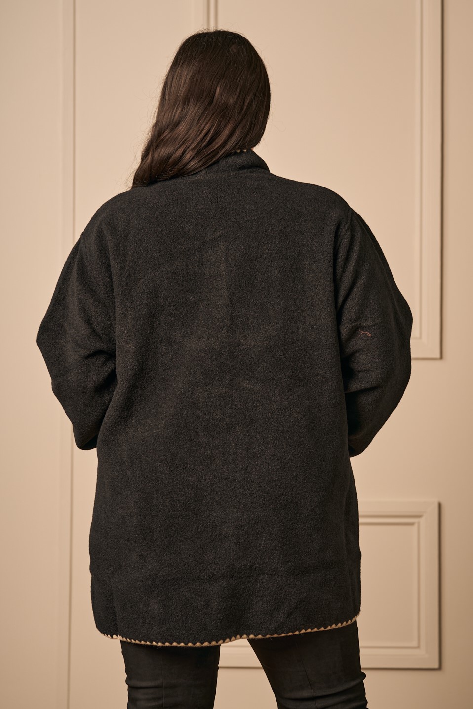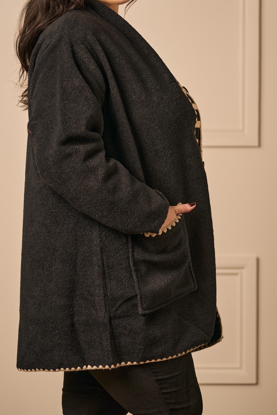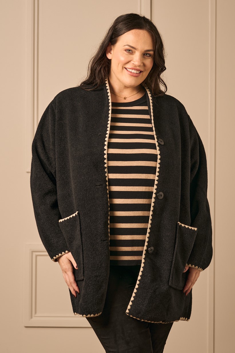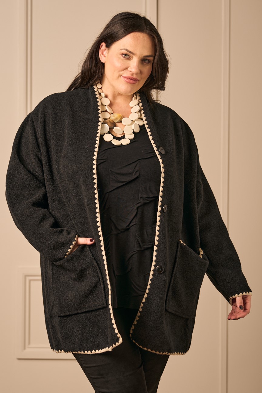I’ve no idea why I’ve called this a scallop jacket as the detail on the cuffs, pockets and hemline is an eye-catching blanket stitch. But heigh-ho – the things we do when we’re working hard!! This jacket is LOVELY! A warm, snuggly texture with the feel of wool, without it being wool, that is perfect for wearing on a crisp cold day. Nice deep patch pockets and 3 buttons feature on the front and a plain back. How can you resist this stunner! in the pictures we’ve teamed it up with jumper which matches the contrast stitching, and also over plain black.