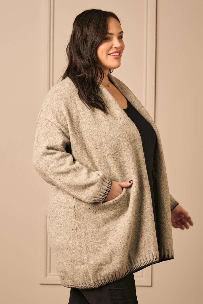 This cardi is your typical snuggler!  Buy a size larger and let it envelope you in the cold winter nights!  It’s so soft and warm, you’ll feel like you’re being cuddled all day, and night, long! The cardi features an inverted roll shawl collar which extends down the front of the cardi.  Let it just curl into you!  2 knitted-in pockets on the front, and long sleeves.  There is a blanket stitch pattern in the ribbing on the cuffs and hemline which makes this sloppy Joe cardi unique.  A must for your winter wardrobe!