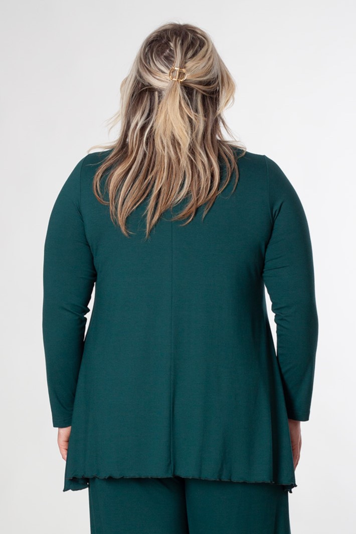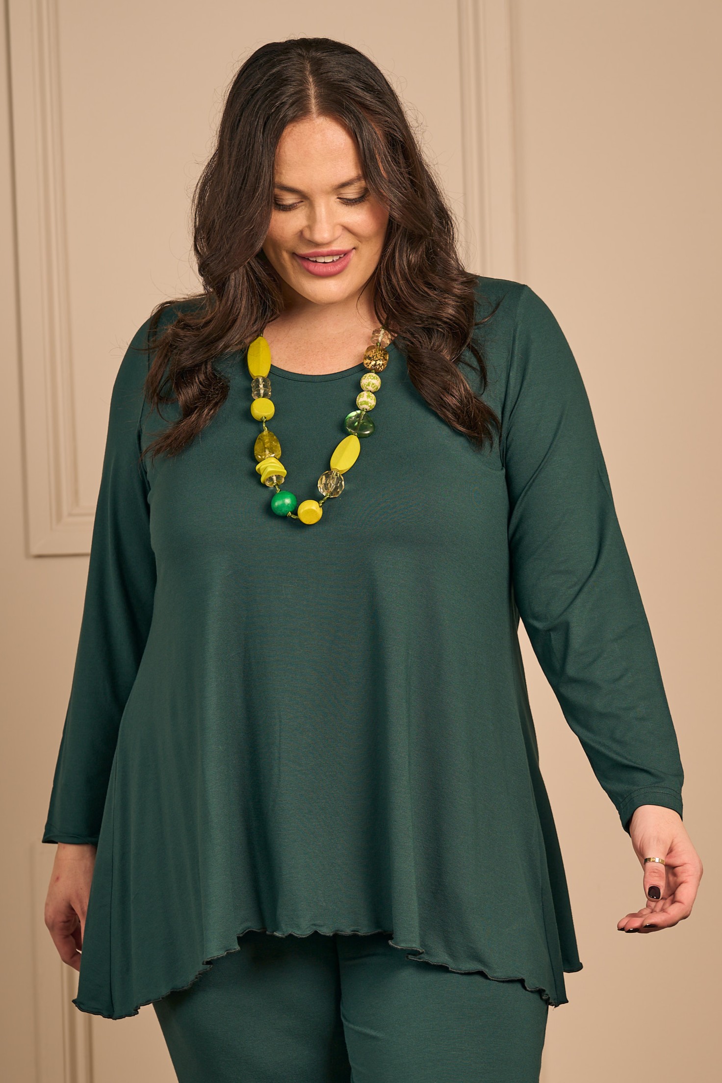 Exelle jersey fabric is in a league of it’s own!  If you’re a fan of quality and value for money, these tee shirts retain their shape after hundreds of washes – I’m still wearing one I have from about 10 years ago!  And it still looks like new!  The fabric is very soft and gorgeous to wear.  The tee shirt features a fitted top opening out to a generous A line shape, with an overlocked stitching on the hem which gives the hemline a slight ‘curly’ look.  A slightly deep and saucy(!) round neck and long sleeves, this will be your BFF for a very long time!