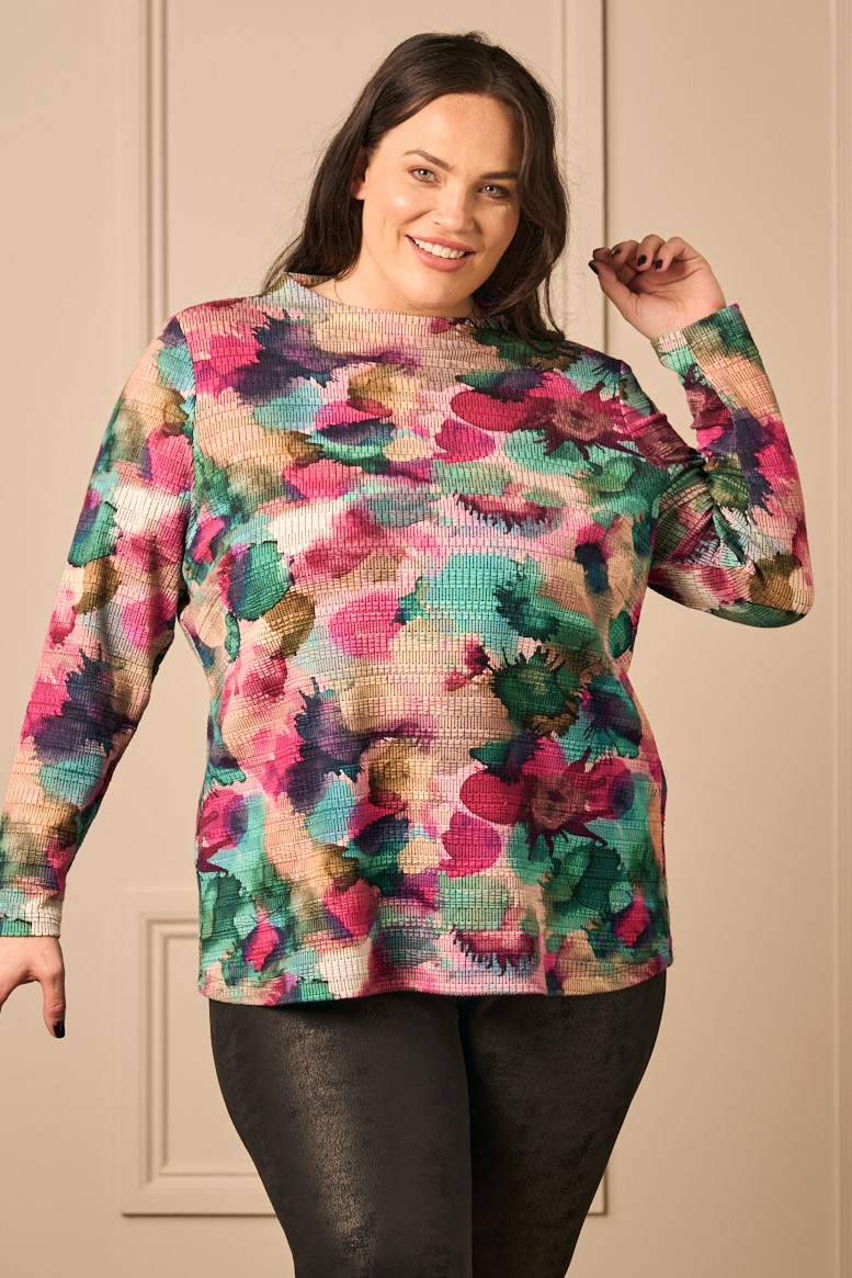 This Mona Lisa jacquard jersey top has a perfect shot of colour to warm up your Autumn wardrobe. It’s a great shape with long sleeves and curved inset pockets . We have described the colour as multi however the combination of the gorgeous colours and the texture of the fabric makes this a very versatile piece. Team up with Jeans for a relaxed casual look or go for a dressed up look with a pair of Faux leather trousers. The soft round neckline allows you to wear the tunic on it’s own or with a shirt or fine roll neck underneath if you want to layer up on colder days.