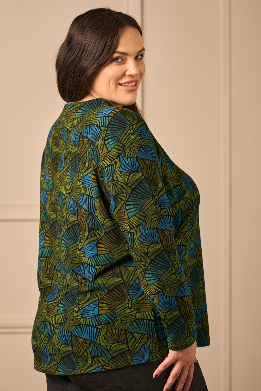 This Mona Lisa top is an absolute beauty on so many levels, the fabric is a soft ribbed jersey that feels like a luxurious velvet needlecord, it’s a great shape with long sleeves and curved inset pockets . We have described the colour as green however the combination of various shades of green and blue give this top a jewel like look – a perfect addition to enrich your Autumn wardrobe. Go for a dressed up look with a pair of faux leather trousers or for a casual look with a pair of jeans. The soft round neckline allows you to wear the tunic on it’s own or with a shirt or fine roll neck underneath if you want to layer up on colder days.