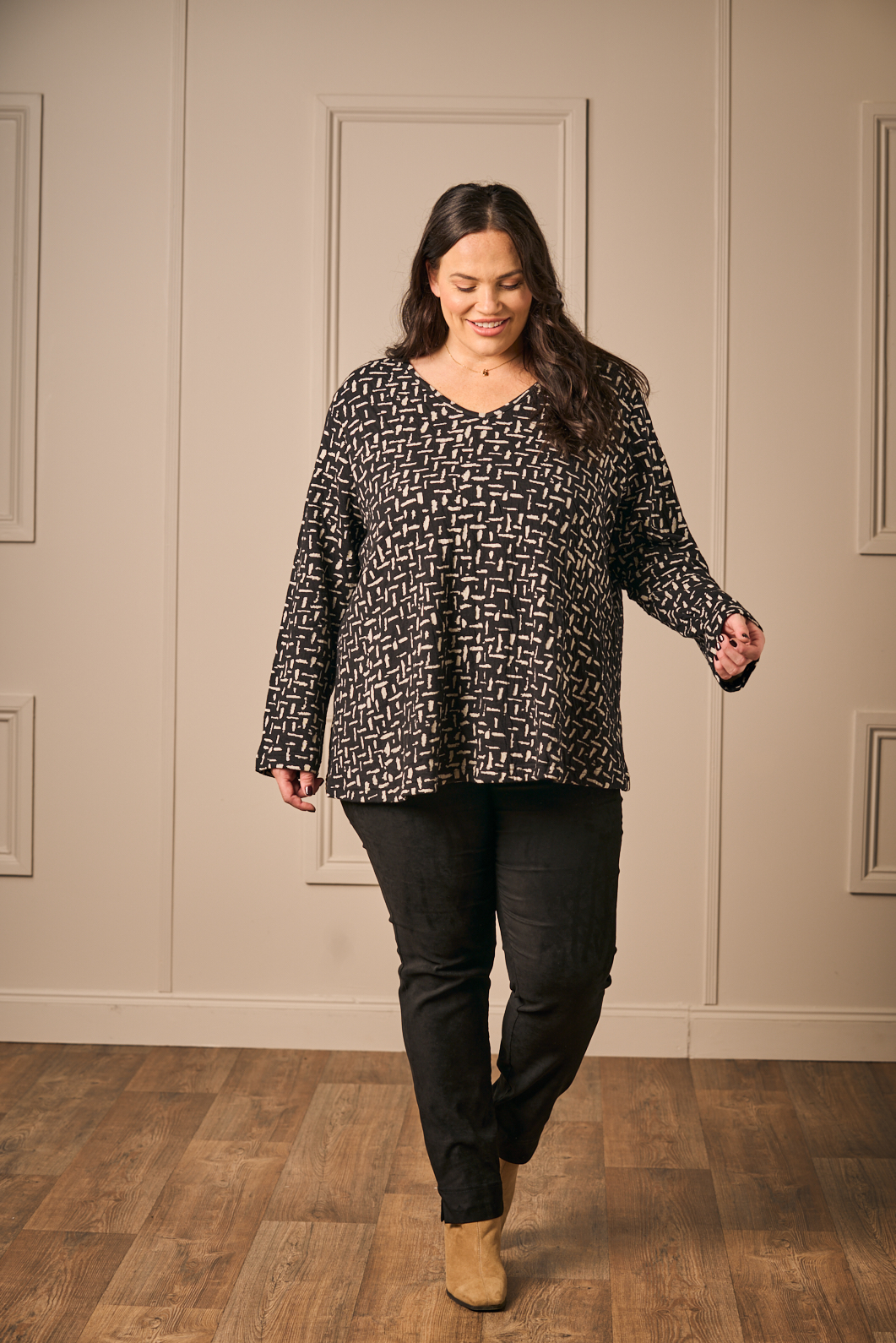 This V neck tee is slightly different in the fabric makeup, and feels warmer and cosier. Plus it’s a more generous fit than the other Orientique tees. It features a flattering V neckline, A line shape and long sleeves for the autumn. We think this can be dressed up or down – looks stunning with the Robell faux suede trousers in our YouTube video!