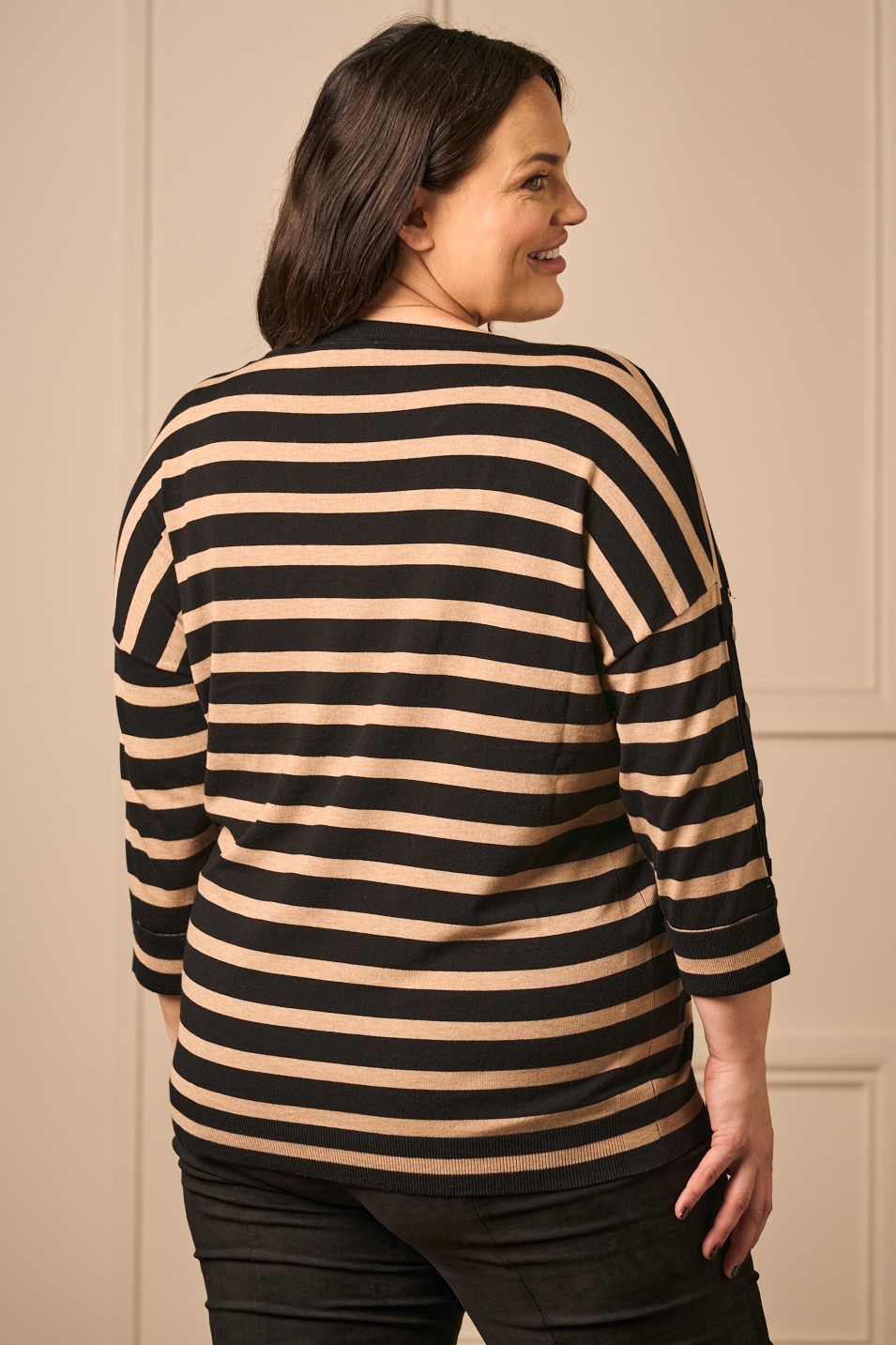 A fabulously soft jumper in a classic black/sand stripe. It features a soft round neckline, dolman 3/4 sleeves with a button feature which leads down to a turn back cuff. It looks fabulous worn with one of the Via Appia faux suede jackets – a complete outfit to take you from Autumn to Spring!